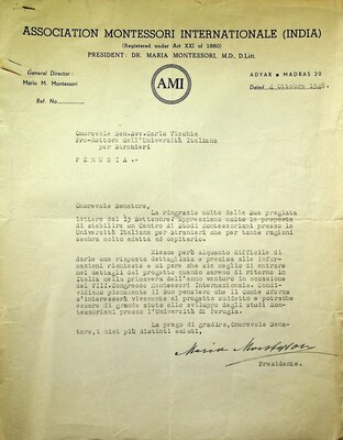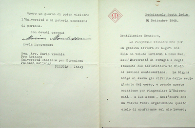 Maria Montessori, lettera dattiloscritta con firma autografa a Carlo Vischia (1894-1970), prorettore dell’Università per Stranieri di Perugia, Kodaikanal (India), 4 ottobre 1948. Risposta alla proposta d’istituzione del Centro Studi Pedagogici presso l’Università per Stranieri di Perugia.