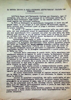 Sintesi della lezione (10 settembre 1949) tenuta da Maria Montessori presso l’Università per Stranieri di Perugia (2 pagine).