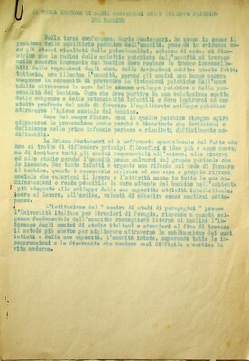 Sintesi della lezione (12 settembre 1949) tenuta da Maria Montessori presso l’Università per Stranieri di Perugia (1 pagina).