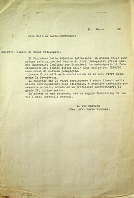 Lettera dattiloscritta di Carlo Vischia a Maria Montessori, Perugia, 24 marzo 1950. Proposta di assumere la carica di presidente del Centro Studi Pedagogici, istituito presso l’Università per Stranieri di Perugia.