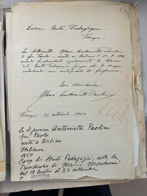 Lettera di Maria Antonietta Paolini che dichiara di aver partecipato al Corso di Studi Pedagogici sotto la presidenza di Maria Montessori dal 19 luglio al 23 settembre 1950.