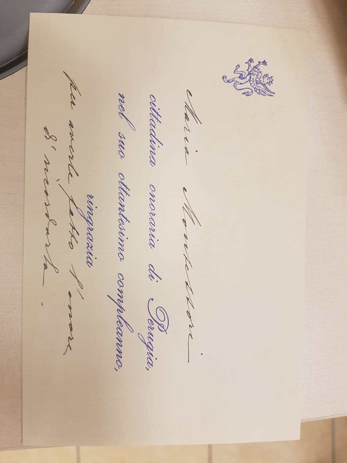 Biglietto autografo in cui Maria Montessori ringrazia per la cittadinanza onoraria ricevuta dal Comune di Perugia.