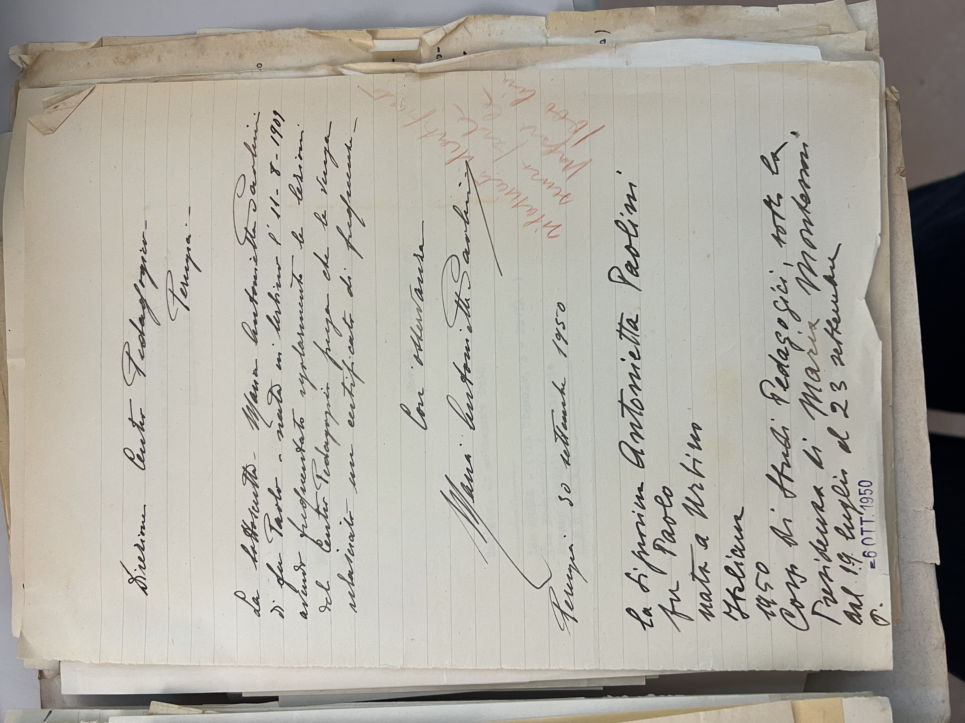 Lettera di Maria Antonietta Paolini che dichiara di aver partecipato al Corso di Studi Pedagogici sotto la presidenza di Maria Montessori dal 19 luglio al 23 settembre 1950.