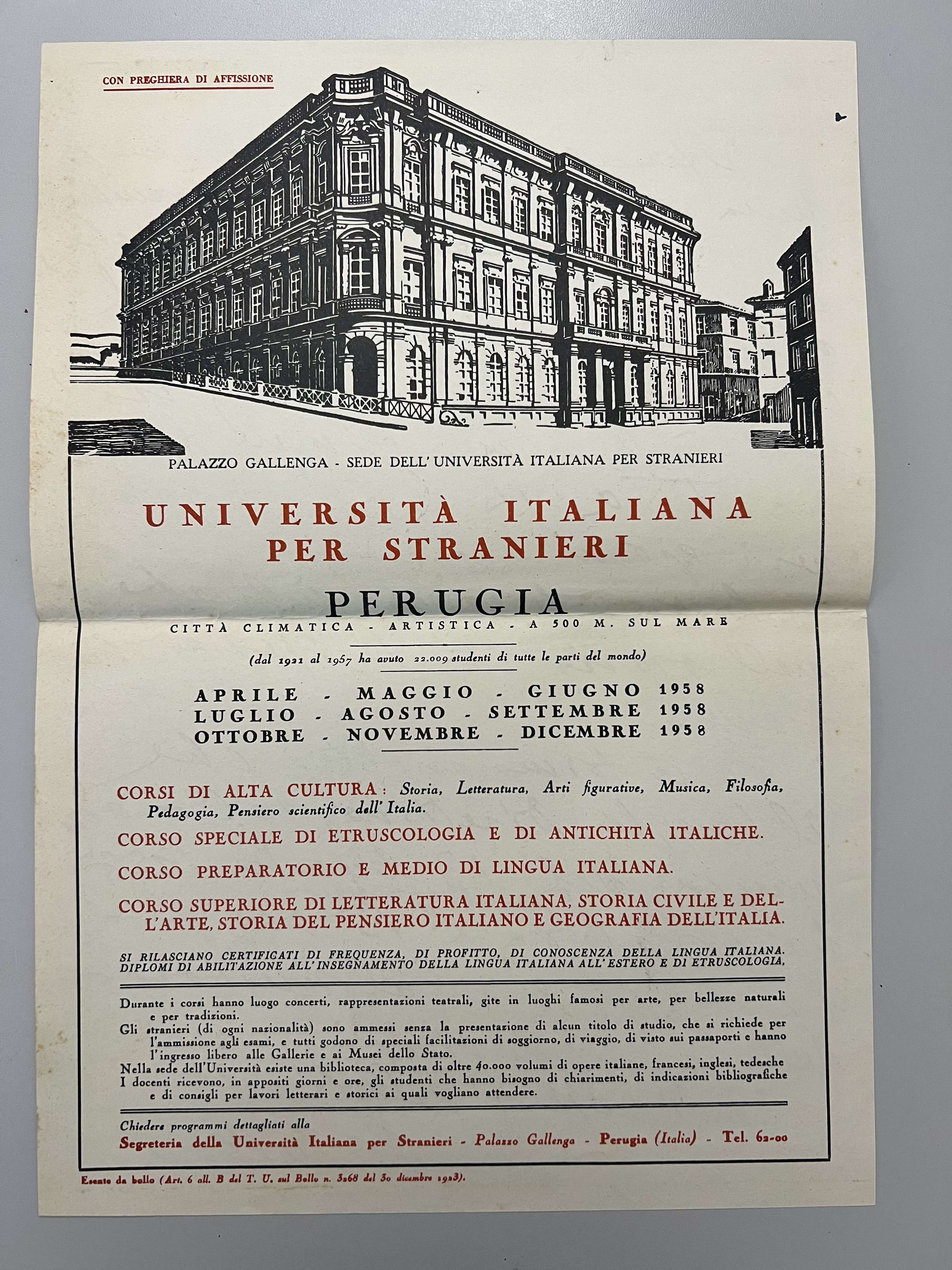 Locandina dei corsi tenuti presso l’Università per Stranieri di Perugia in italiano.