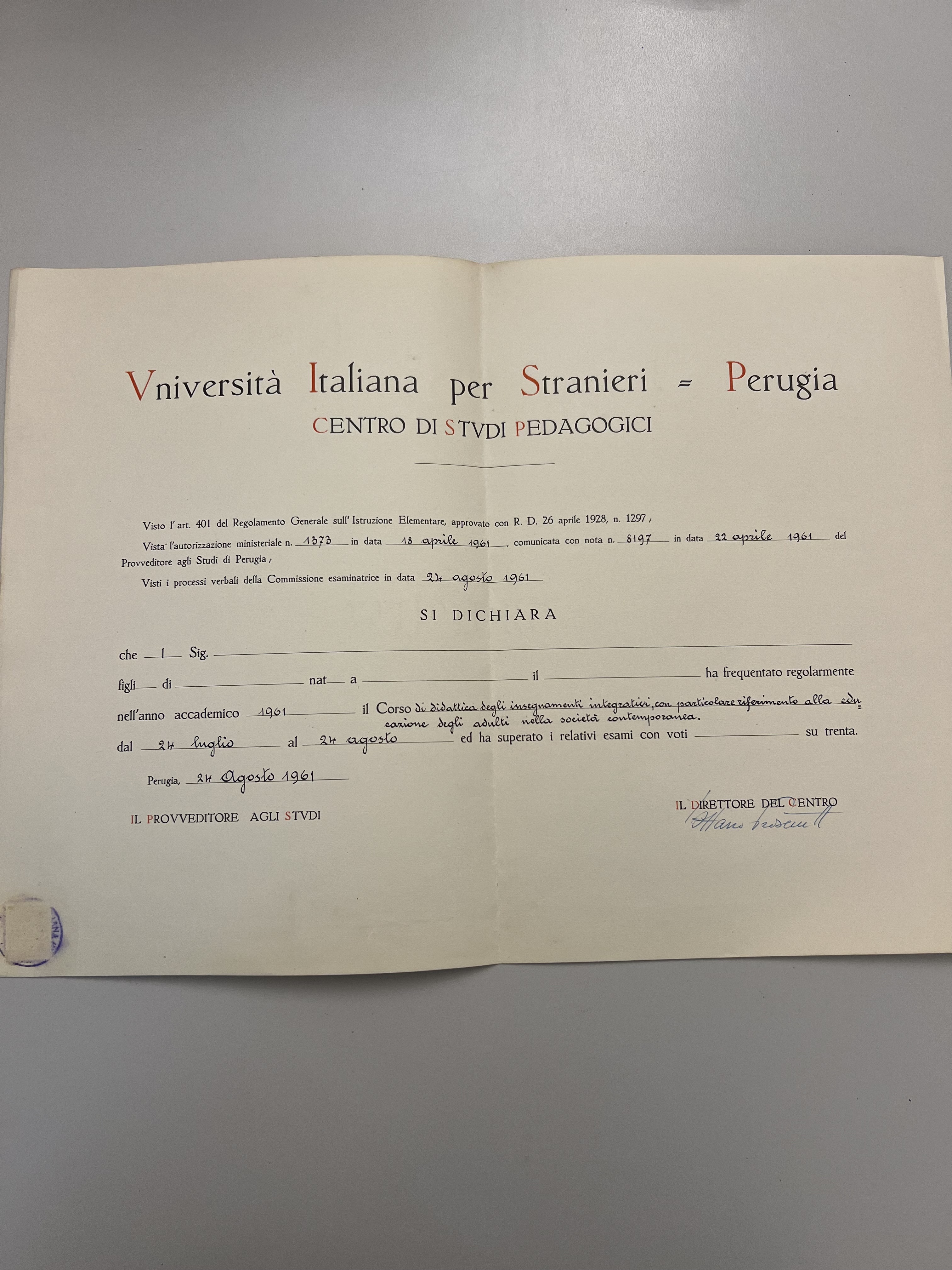 Attestato finale di partecipazione al corso del Centro Studi Pedagogici.