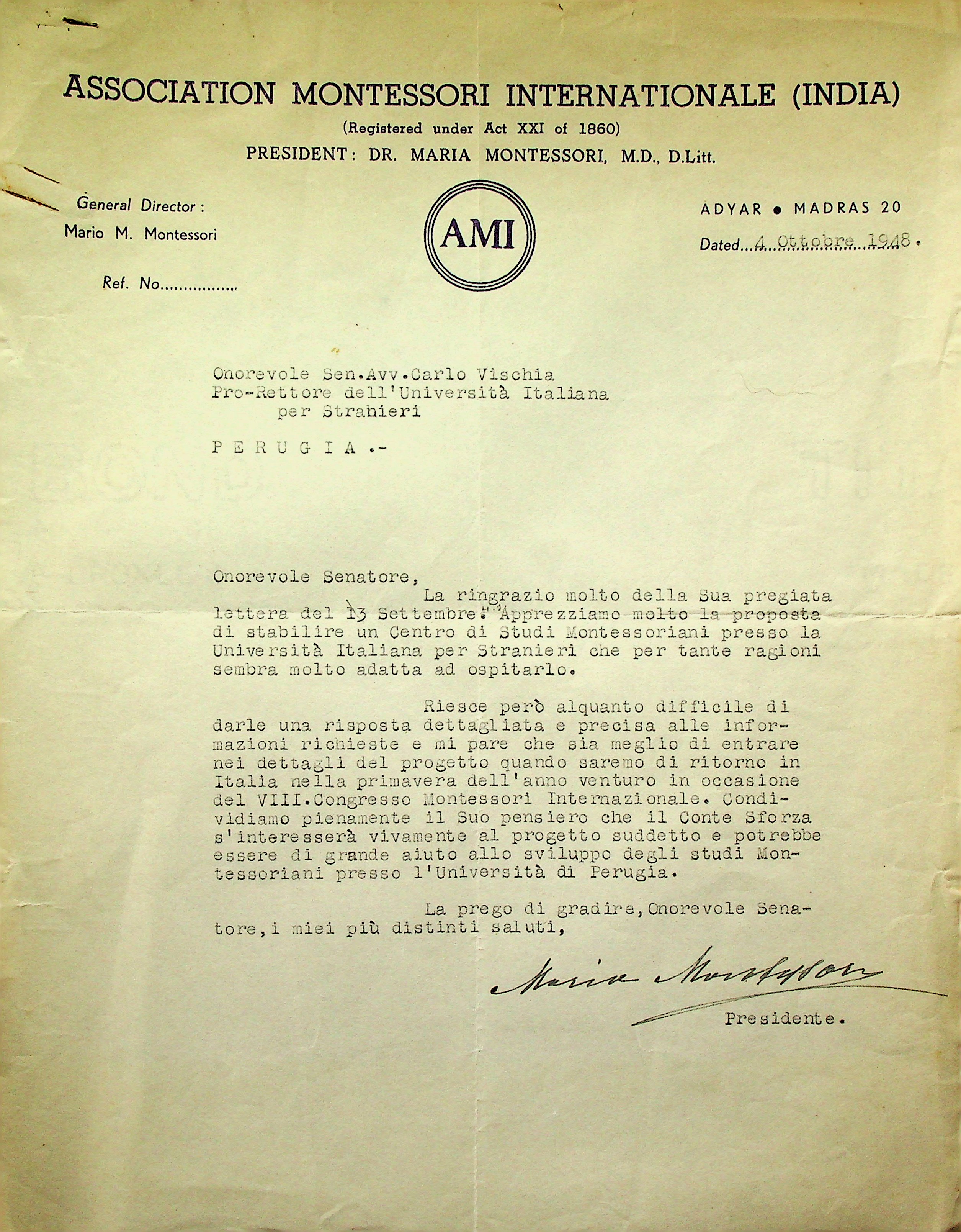 Maria Montessori, lettera dattiloscritta con firma autografa a Carlo Vischia (1894-1970), prorettore dell’Università per Stranieri di Perugia, Kodaikanal (India), 4 ottobre 1948. Risposta alla proposta d’istituzione del Centro Studi Pedagogici presso l’Università per Stranieri di Perugia.