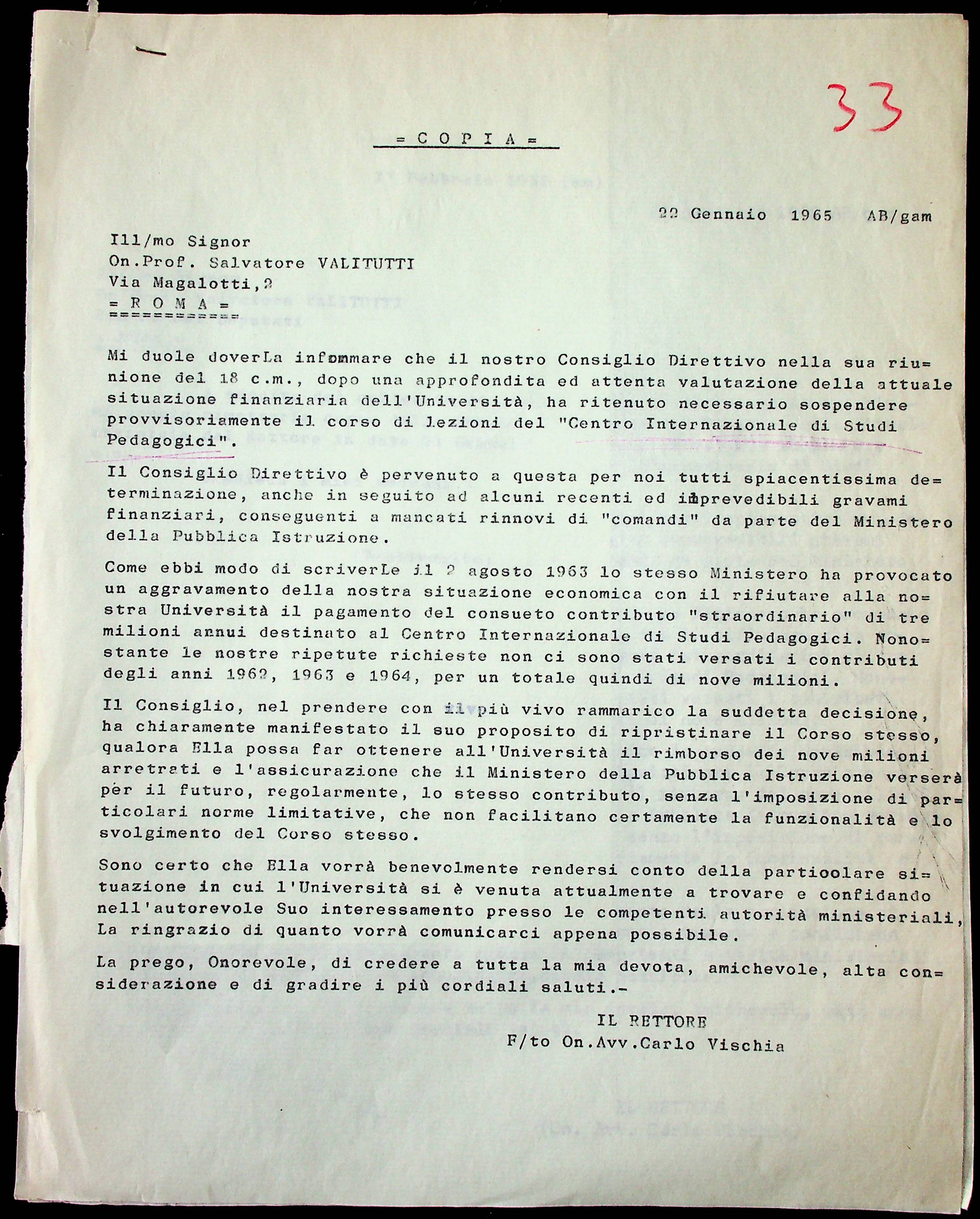 Comunicazione della sospensione provvisoria del corso del Centro Internazionale di Studi Pedagogici presso l’Università per Stranieri di Perugia, per mancanza di finanziamento da parte del Ministero della Pubblica Istruzione.