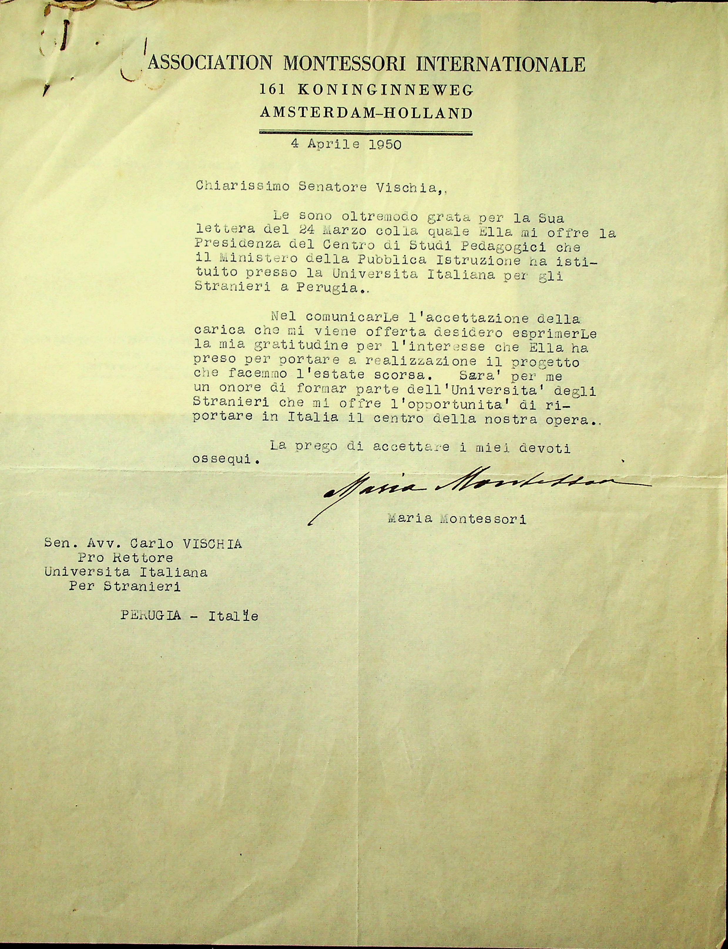 Lettera dattiloscritta, con firma autografa, di Maria Montessori a Carlo Vischia, Amsterdam, 4 aprile 1950. Accoglimento della proposta di assumere la carica di presidente del Centro Studi Pedagogici, istituito presso l’Università per Stranieri di Perugia.