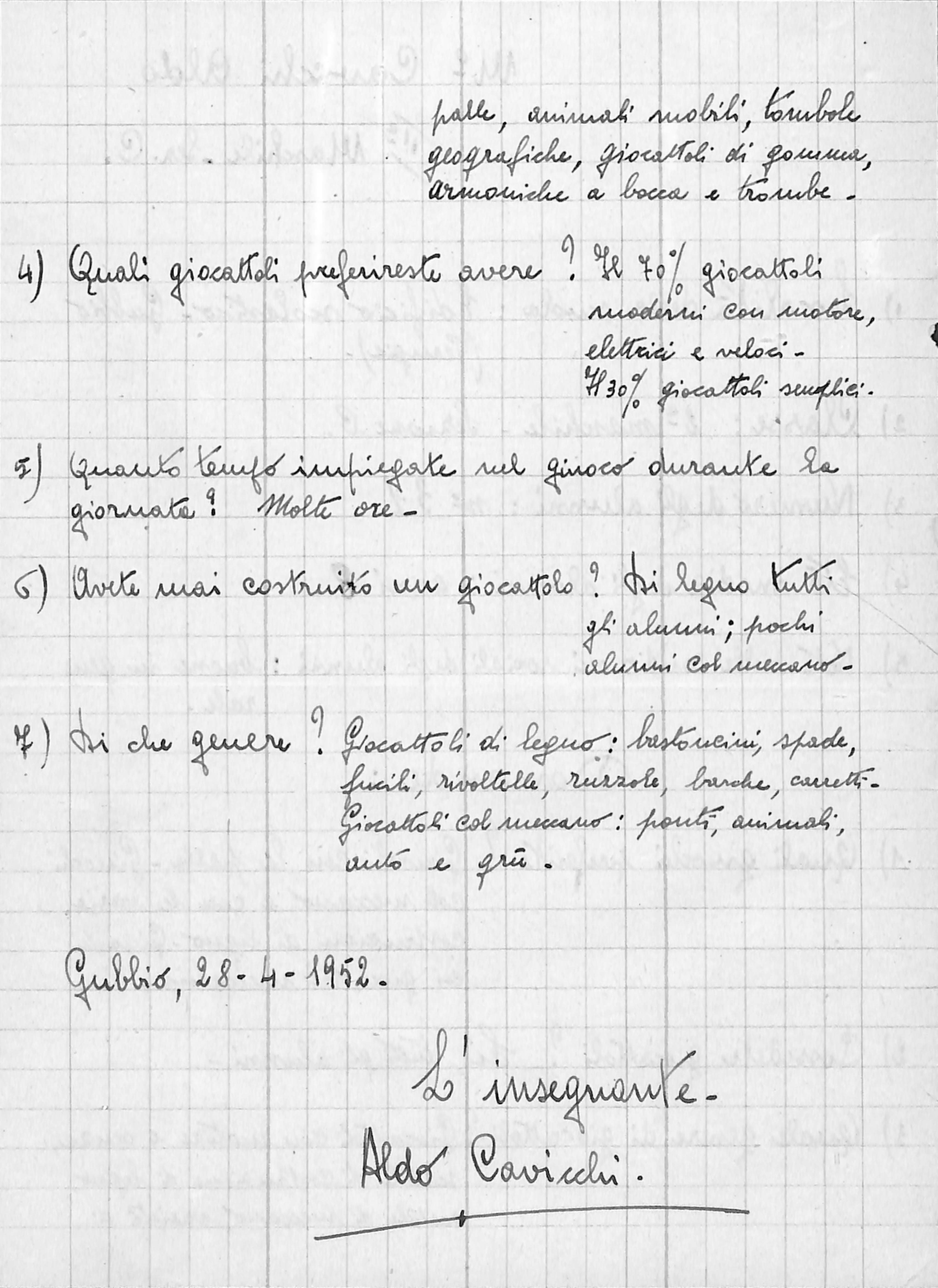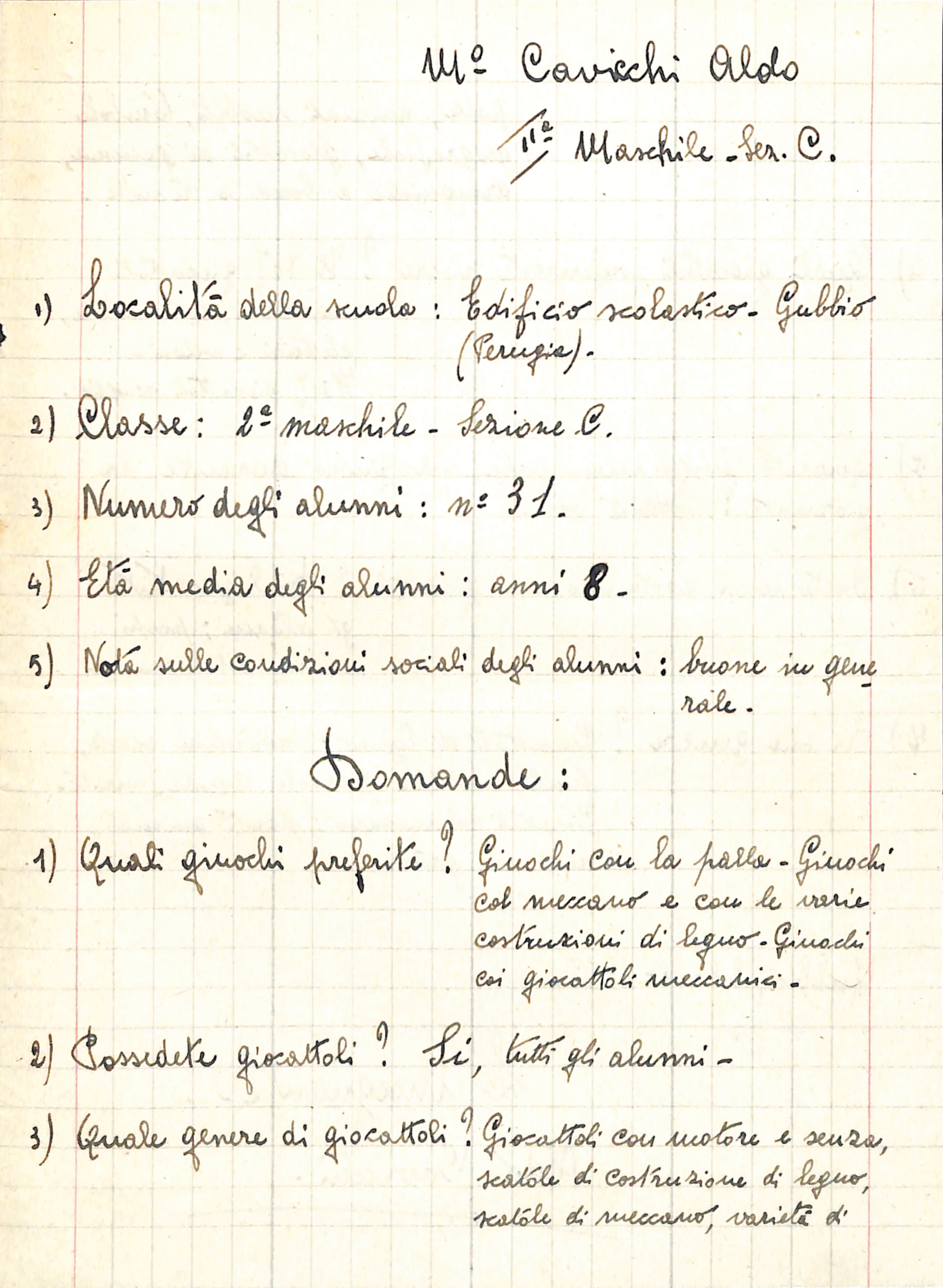 Relazione manoscritta dell’insegnante Aldo Cavicchi sulla classe seconda della scuola primaria di Gubbio, aprile 1952.
