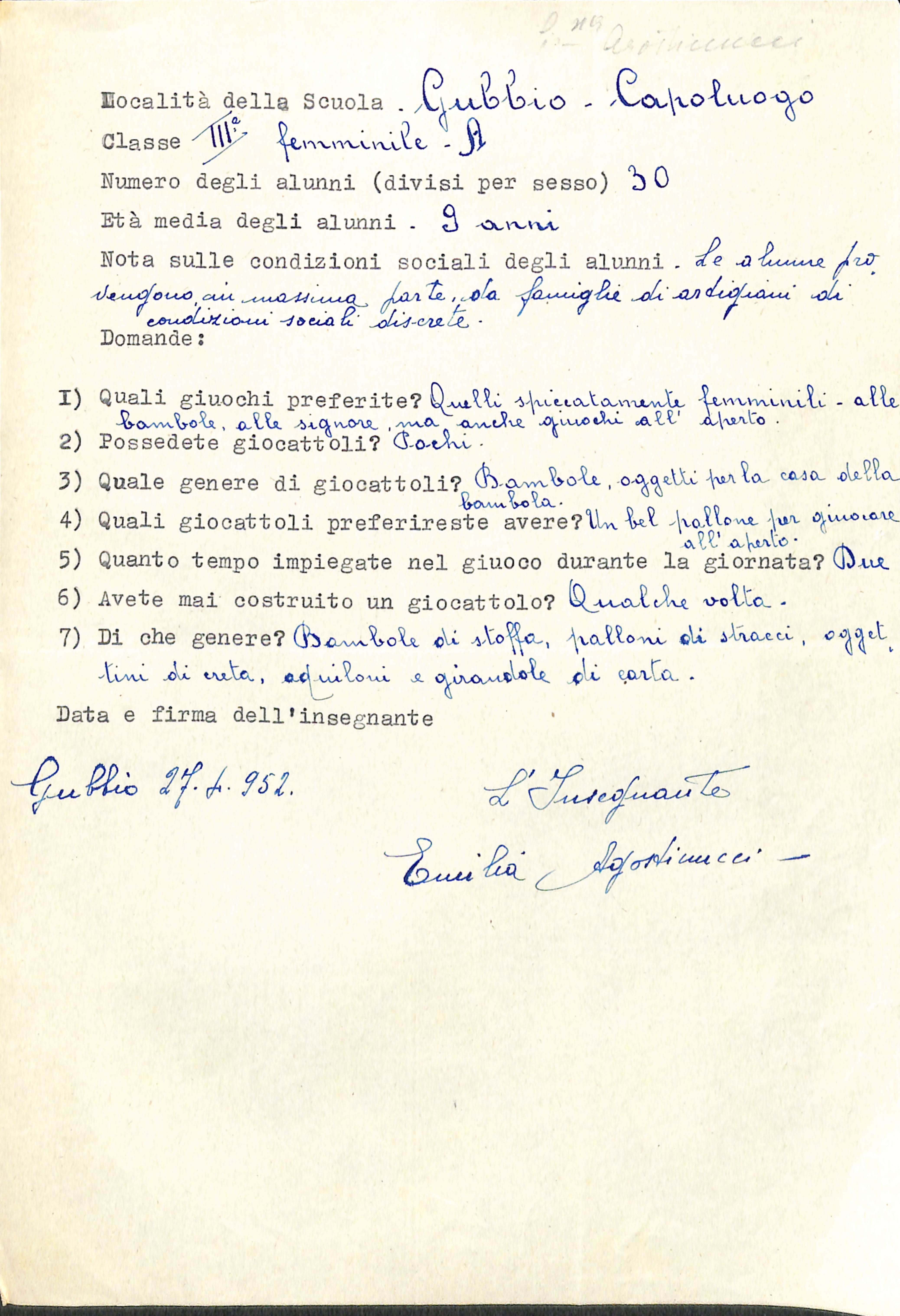 Questionario dattiloscritto per l’indagine sul gioco, con le risposte prevalenti, scritte a penna dall’insegnante Emilia Agostinucci della scuola media di Gubbio, 27 aprile 1952.