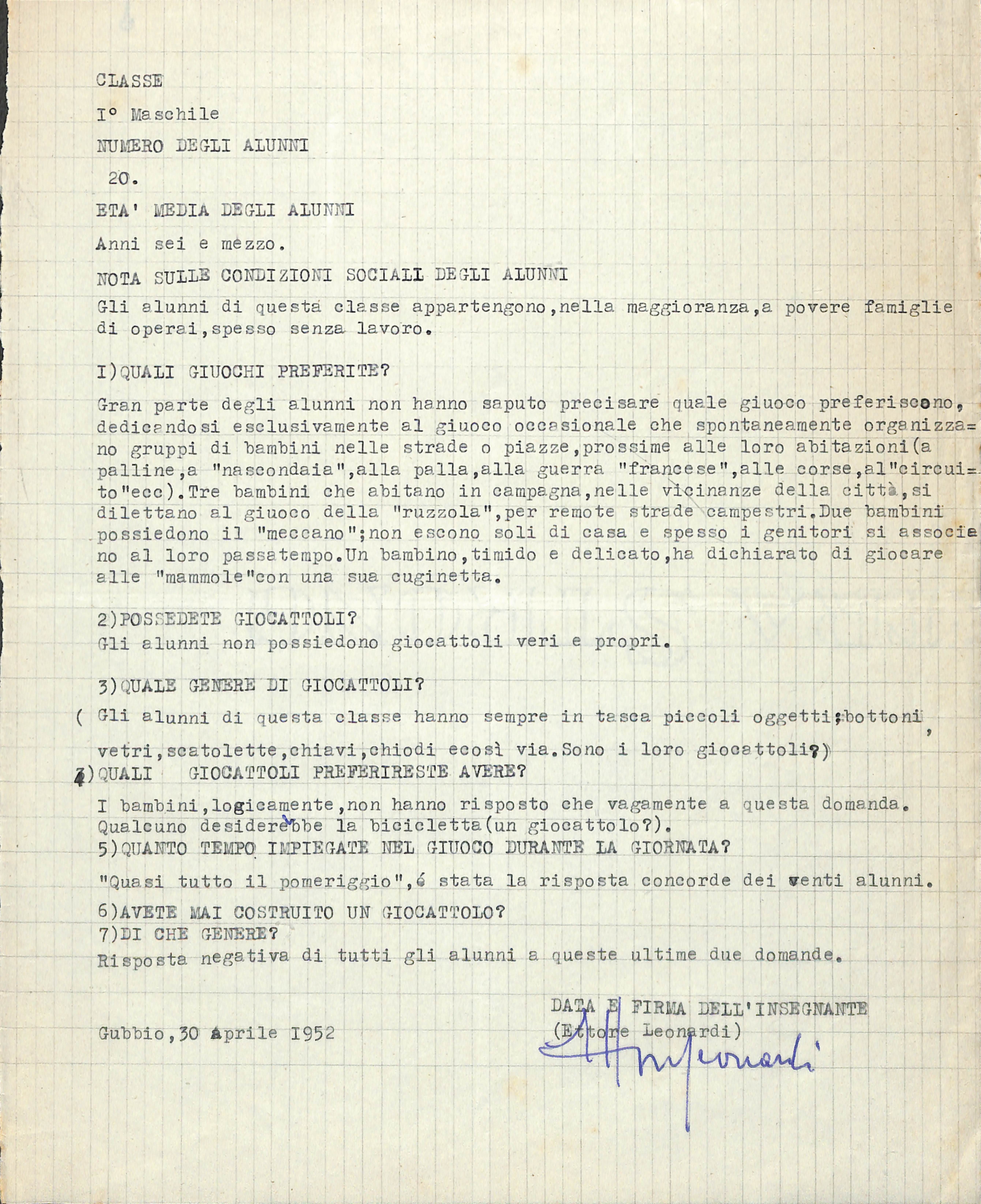 Questionario e risposte dattiloscritti, con firma autografa, dell’insegnante Ettore Leonardi, scuola elementare di Gubbio, 30 aprile 1952.