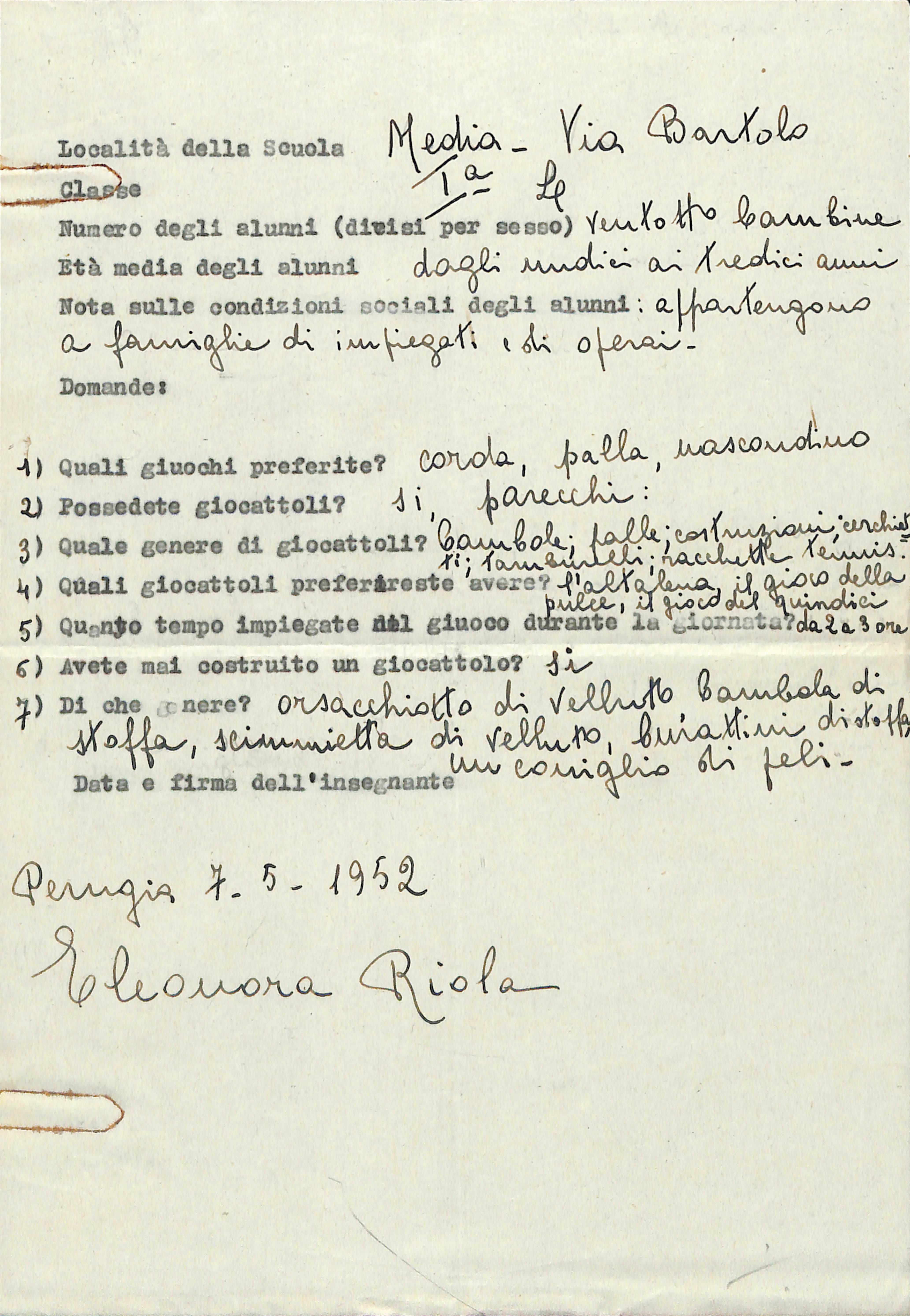 Documento dattiloscritto, con firma autografa, dell’insegnante Eleonora Riola, scuola media via Bartolo, 7 maggio 1952.
