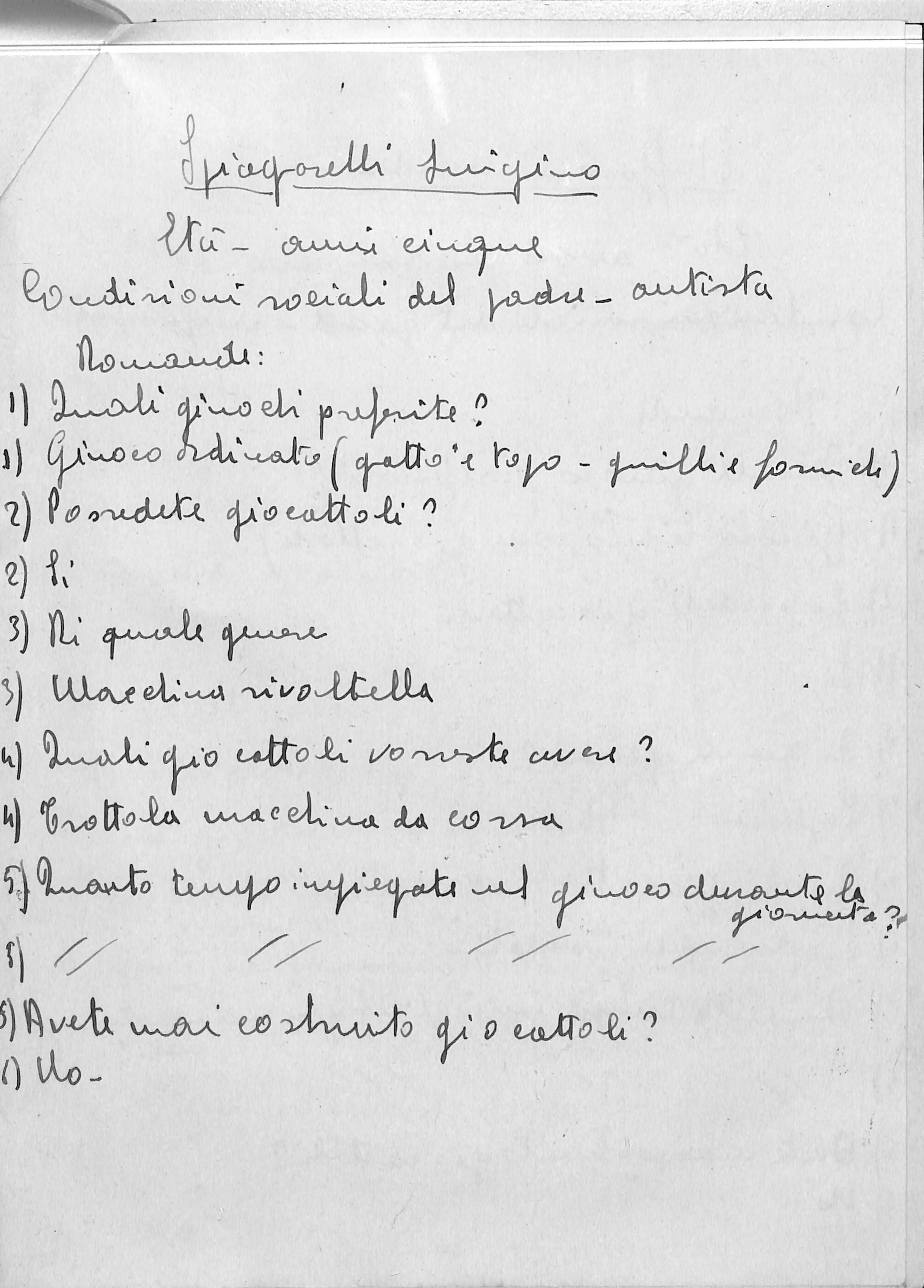 Scheda manoscritta dell’alunno Luigino Spigarelli, Istituto magistrale di via Armanni, Giardino dell’infanzia.